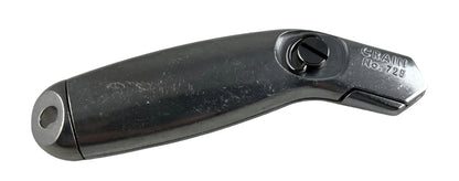 Navaja con cuchilla de afeitar y cargador de carga trasera. Utiliza cuchillas ranuradas estándar para alfombras.