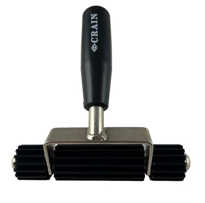 El rodillo Bigfoot está fabricado con tres secciones de rodillos acanalados anchos. La amplia superficie de las superficies acanaladas evita que los hilos se enganchen, protegiendo los hilos de las fibras delicadas de la alfombra mejor que las ruedas de estrella. Las nervaduras también proporcionan una presión concentrada para forzar el respaldo de la alfombra hacia el adhesivo termofusible. Este es el mejor rodillo de costura para alfombras de sajonia, felpa y terciopelo de denier fino. Ancho del rodillo: 5 5/8 ". Peso neto: 15 oz.