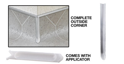 These silver metal corners cover a sheet vinyl outside corner. They cover up problems at the corner, and are an excellent solution for repairs. They are made approximately 6 inches long to cover the corner from floor height up to 6 inches if necessary. The bottom portion is contoured to the shape of a standard cove. They are easily trimmed to a shorter height using a pair of snips. They can be adhered to vinyl, linoleum, or like sheetgoods using a hot glue gun.